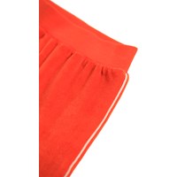 Rote Hose aus Öko-Velours mit Orange. Die Hose hat elastische gerippte Kanten an der Taille und den Knöcheln sowie weiße Paspeln entlang der Beine.