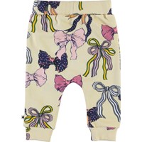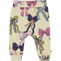 Shona sind ein Paar hellgelbe Babyhosen mit Druck von farbigen Schleifen. Die Hose hat einen elastischen Taille und Beinende. Ecocert Greenlife, certifikationsnr. 197496.