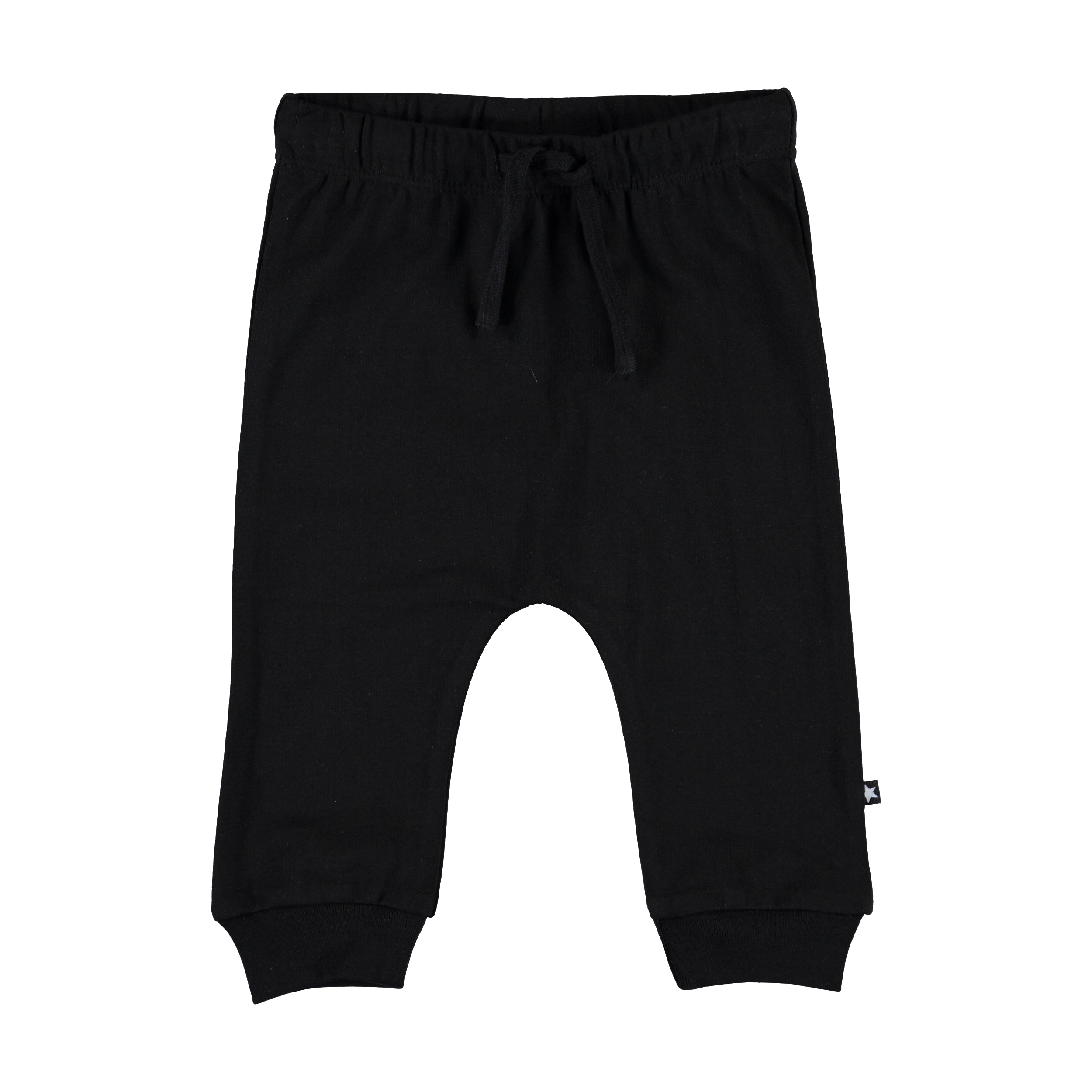 Sille ist eine geräumige Babyhose in Schwarz. Sille hat eine elastische Taille mit einem Kordelzug.