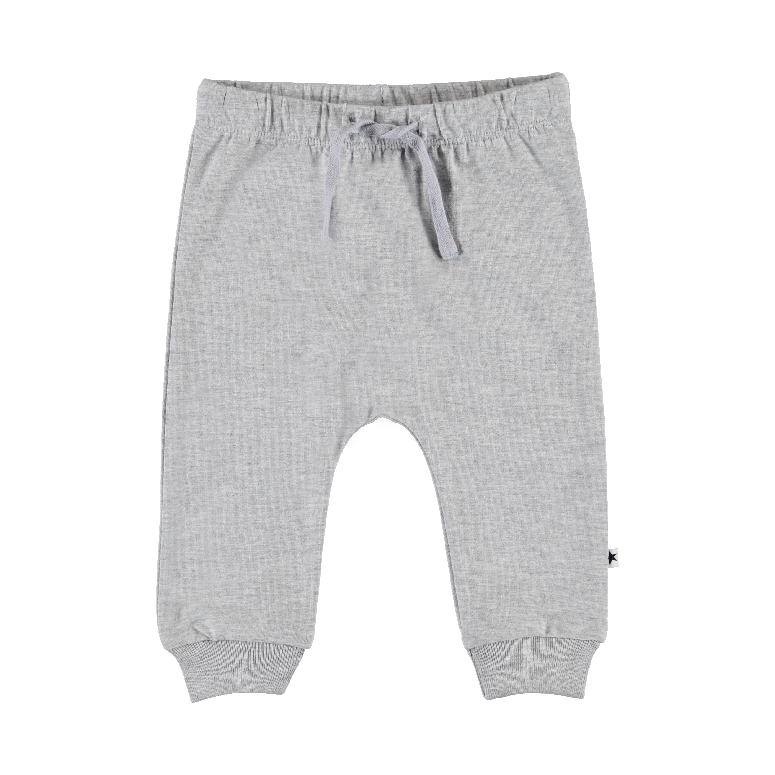 Sille ist eine geräumige Babyhose in Grau. Sille hat eine elastische Taille mit einem Kordelzug.