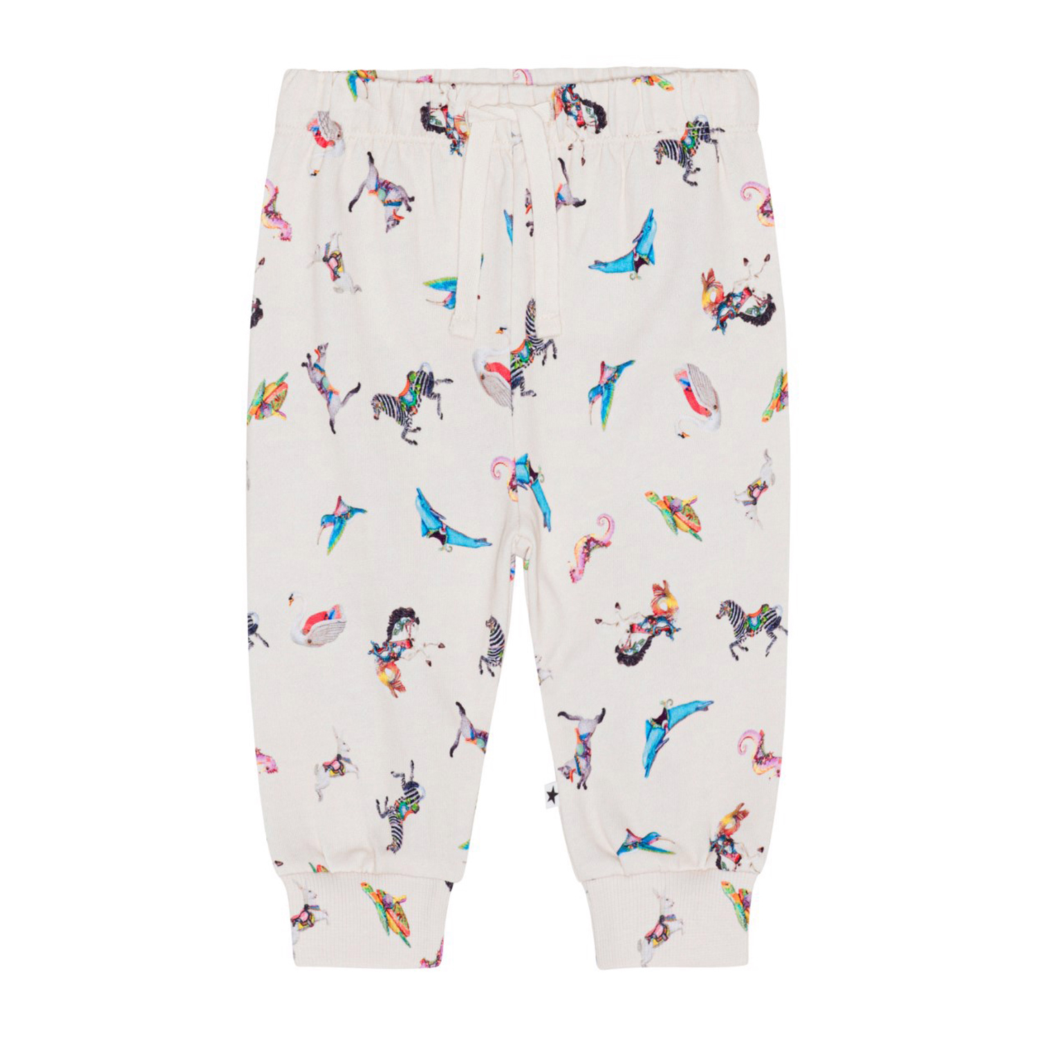Cremefarbene Jogginghose für die Kleinen aus Öko-Baumwolle. Die Hose hat einen Gummizug und Bänder in der Taille sowie gerippte Kanten an den Beinen. Die Hose lässt sich leicht an- und ausziehen und bietet viel Bewegungsfreiheit. Die Hose hat einen verspielten und festlichen Aufdruck aus Karusselltieren in allen möglichen Farben. Kombinieren Sie die Hose mit dem passenden Pullover und erhalten Sie ein komplettes Set aus weichem Jersey.