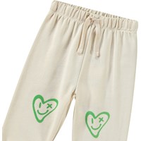 Weiche Hosen aus Öko-Baumwolle für die Kleinen. Die Hosen haben einen elastischen Bund mit Kordelzug und gerippte Bündchen an den Knöcheln. Sie sind leicht an- und auszuziehen und bieten viel Bewegungsfreiheit. Dieser Stil hat ein ungefüttertes Interieur, das an einem heißen Tag angenehm kühl ist. Die Hosen sind hellbeige mit einem grünen lächelnden Sprühherz. Kombinieren Sie sie mit einem passenden Sweatshirt für ein komplettes Outfit.