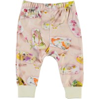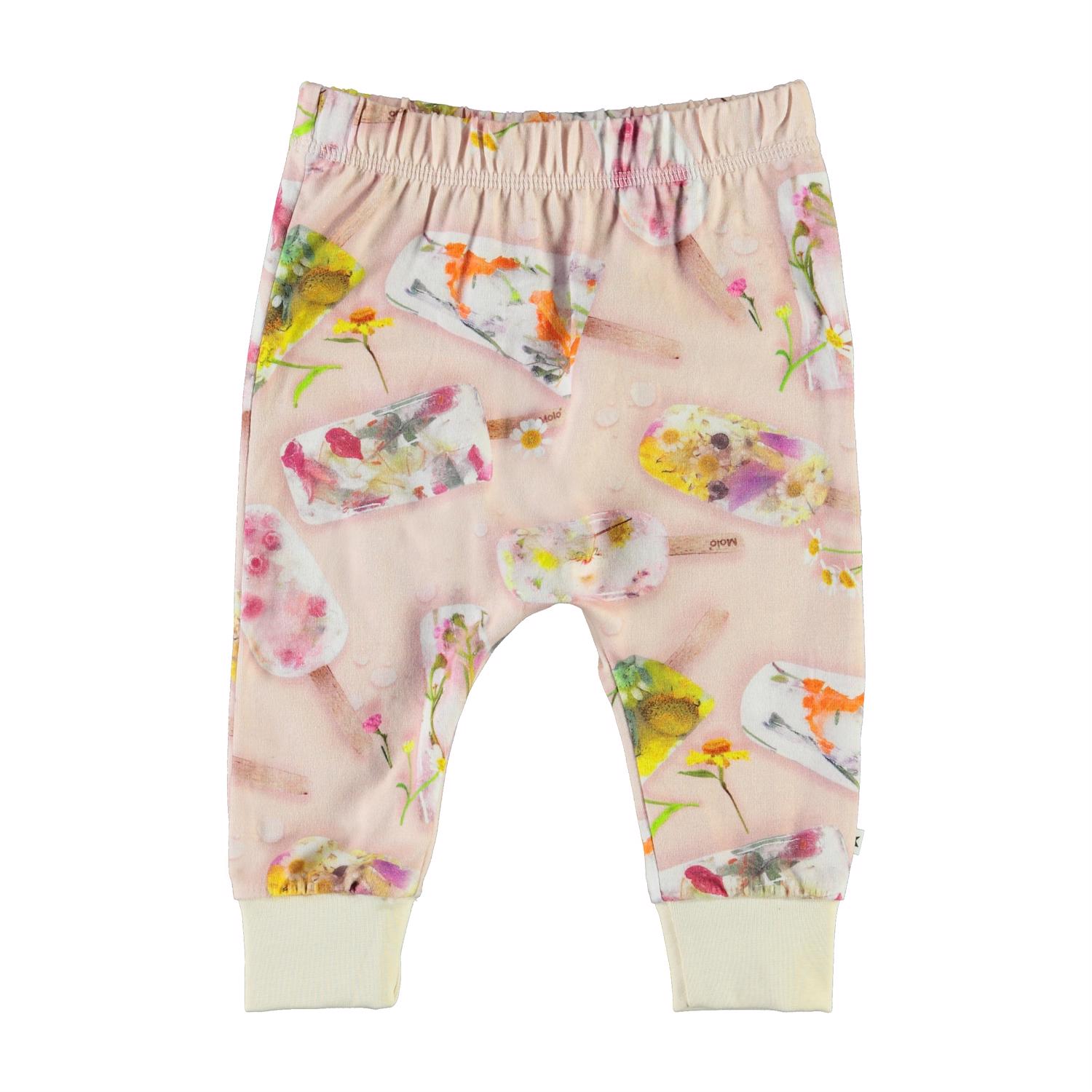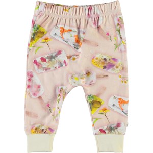 Simone sind ein Paar rosa Babyhosen mit Eis-Druck. Molo hat selbst diese schönen Blumen zu Eis gefroren, die zu diesem Druck auf den Hosen wurden. Die Hosen haben ein Gummiband in der Taille und breite graue elastische Kanten an den Knöcheln. Ecocert Greenlife, certifikationsnr. 197496.