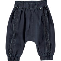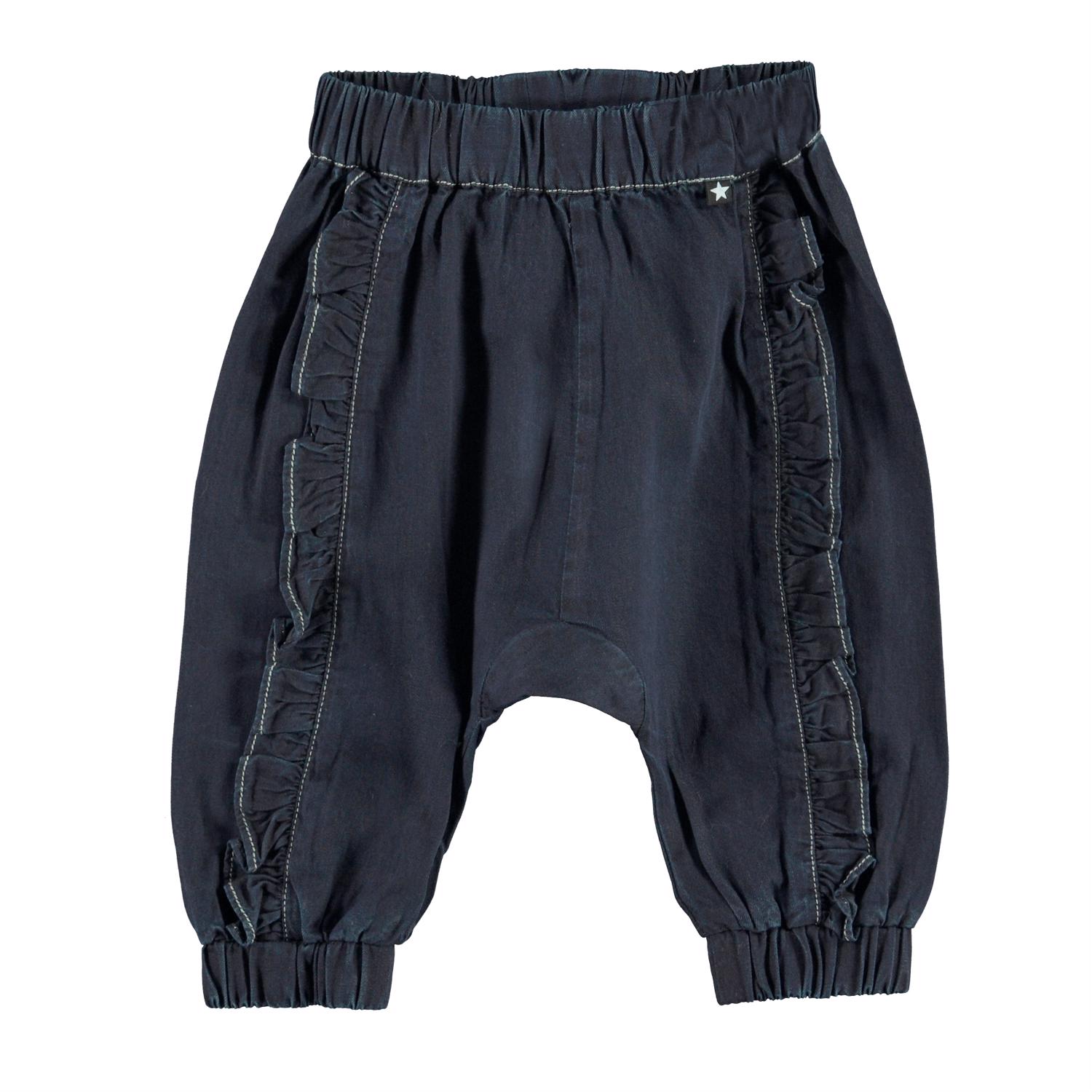 Sophia ist eine dunkelblaue Jeanshose mit einer geräumigen Passform und Rüschen an der Vorderseite. Die Hose hat eine elastische Taille, die dafür sorgt, dass die Hose gut sitzt.