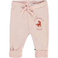 Sora ist eine rosa Öko-Hose mit Bindeband und Bindeband in der Taille. Die Hose hat einen süßen Pferdedruck und den Text „The Connectedness of Everything“. Kombinieren Sie mit passendem Oberteil.