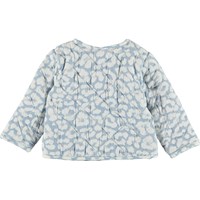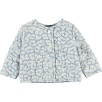 Heaven ist eine gesteppte Babyjacke mit hellblauem Leopardenmuster. Die Jacke hat vorne einen Knopfverschluss.