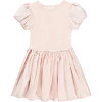 Rosa Kleid für die Kleinen aus Bio-Baumwolle. Das Oberteil hat eine enge Passform aus geripptem Jersey mit kurzen Puffärmeln aus Popeline, und der angenähte Popeline-Rock hat ein schönes Volumen.