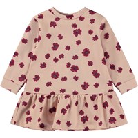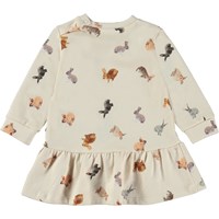 Cremeweißes Babykleid mit einem Aufdruck süßer kleiner Kaninchen. Das Kleid ist aus 100% Baumwolle. Das Kleid hat lange Ärmel, Druckknöpfe an einer Schulter und einen kleinen Rock unten.