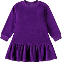 Lila Samtkleid für die Kleinsten, aus einer weichen Baumwollmischung gefertigt. Das Kleid hat einen Rundhalsausschnitt und lange Ärmel mit gerippten Bündchen. Es gibt Druckknöpfe auf einer Schulter und einen kleinen Rock am unteren Ende.