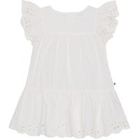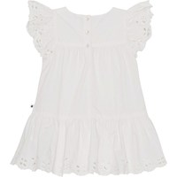 Weißes Kleid für die Kleinen. Das Kleid hat einen Knopfverschluss hinten, kleine Rüschenärmel und einen Rock mit Lochstickerei.