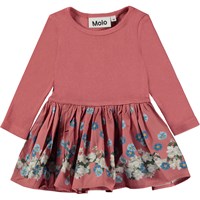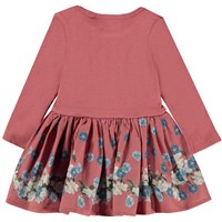 Rotes langärmliges Babykleid aus 100% Öko-Baumwolle. Der obere Teil des Kleides ist aus geripptem Jersey, während der angenähte Rock aus Popeline und mit Blumendruck ist.