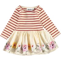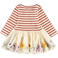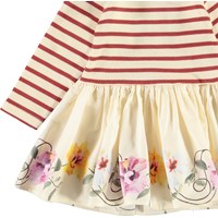 Candi ist ein Babykleid im Zweiteiler-Look mit langen Ärmeln. Das Obermaterial ist aus rotem und cremefarbenem Rippmaterial, während der Rock einen Blumendruck hat.