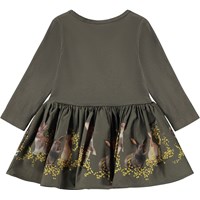 Braunes langärmliges Babykleid aus 100% Öko-Baumwolle. Der obere Teil des Kleides ist aus geripptem Jersey, während der angenähte Rock aus Popeline und mit einem Kaninchen-Print ist.