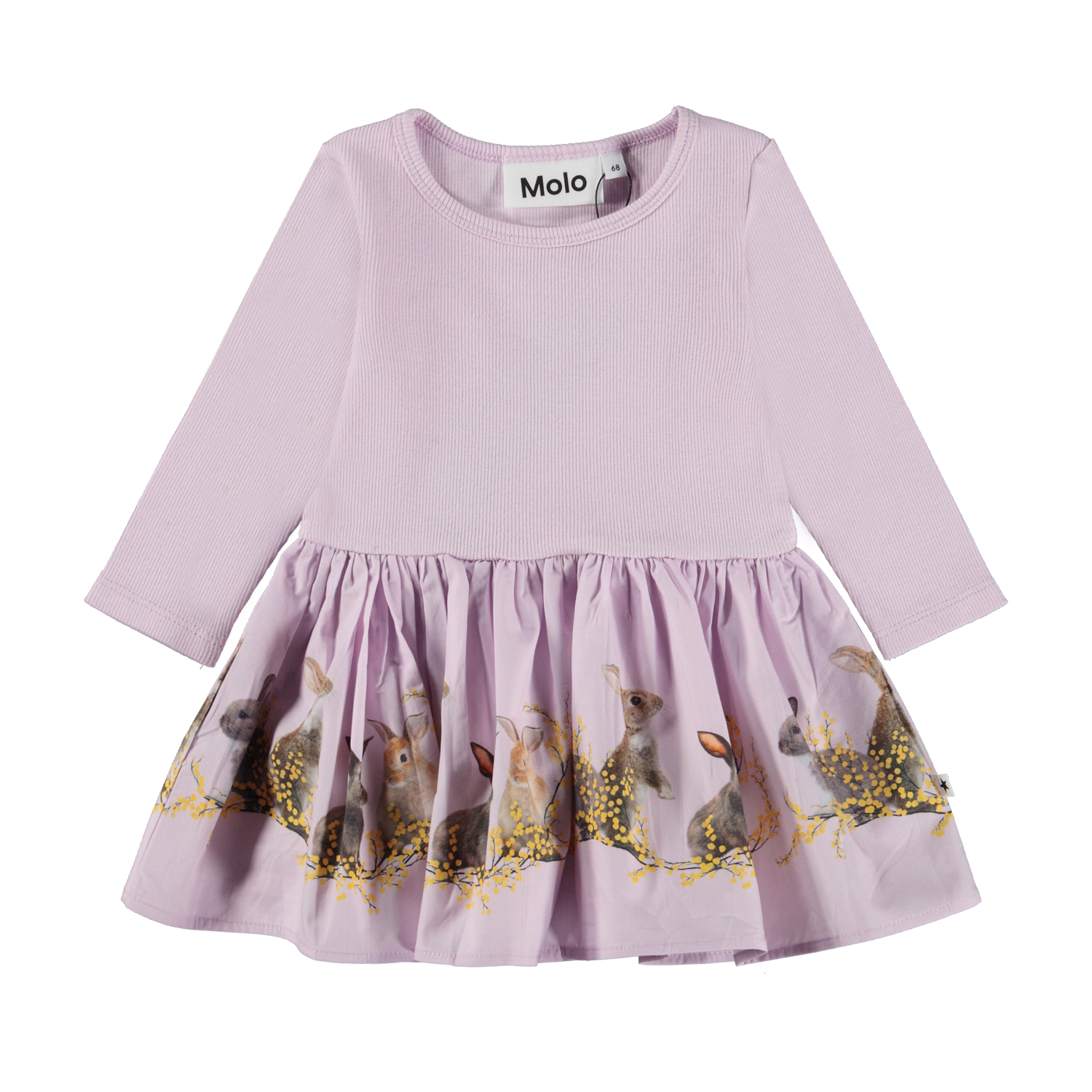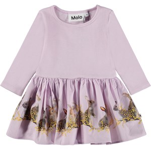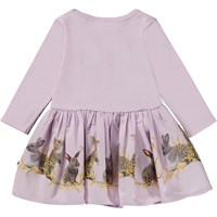 Helllila langärmliges Babykleid aus 100% Öko-Baumwolle. Der obere Teil des Kleides ist aus geripptem Jersey, während der angenähte Rock aus Popeline und mit einem Kaninchen-Print ist.