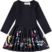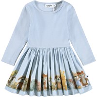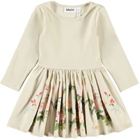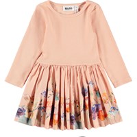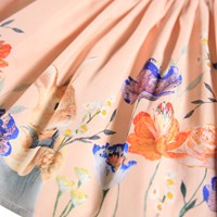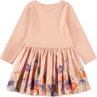 Langärmeliges Kleid für die Kleinen aus Öko-Baumwolle. Das Kleid ist pfirsichfarben mit einem Aufdruck von Tieren in Kleidern und Blumen. Das Oberteil ist figurbetont aus geripptem Jersey, während der Rock aus Popeline ist, was dem Kleid Volumen verleiht. Es ist einfach anzuziehen und angenehm zu tragen.