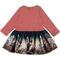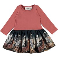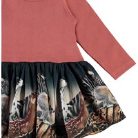 Candi ist ein zweiteiliges Babykleid mit langen Ärmeln. Das Oberteil ist in dunkelrosa Ripp, während der Rock einen Druck von verschiedenen Tiere unter dem Sternenhimmel hat.