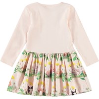 Langärmeliges Kleid für die Kleinen aus Öko-Baumwolle. Das Kleid ist rosa mit einem Druck von Kaninchen und Löwenzahn auf dem Rock. Das Oberteil ist eng anliegend aus geripptem Jersey und hat einen runden Halsausschnitt mit einem Knopf auf der Schulter, der das An- und Ausziehen erleichtert. Angebrachter Rock mit schönem Volumen.