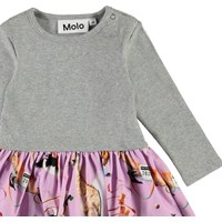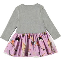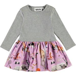 Carel ist ein zweiteiliges Babykleid mit langen Ärmeln. Das Oberteil ist in grauen Ripp, während der Rock in lila ist und einen Druck von Tieren hat, die Sport treiben.