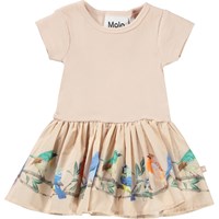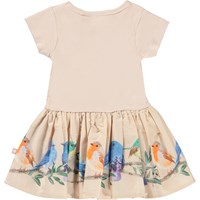 Carin ist ein rosafarbenes zweiteiliges Babykleid mit kurzen Ärmeln und Schößchenrock mit Vogelaufdruck.