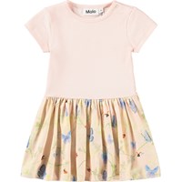 Rosa und gelbes Kleid für die Kleinen aus weicher, biologischer Baumwolle mit Schmetterlingsdruck auf dem Rock. Das Oberteil hat kurze Ärmel und eine enge Passform aus geripptem Jersey, während der angenähte Rock ein schönes Volumen hat. Lässt sich leicht mit einem Druckknopf an der Schulter schließen.