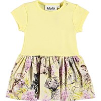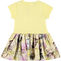 Catja ist ein hellgelbes Babykleid mit geripptem Oberteil und einem Rock mit Aufdrucken von Kätzchen, die in einer Glyzinie spielen.