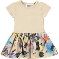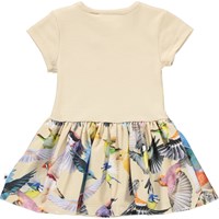 Catja ist ein hellgelbes zweiteiliges Babykleid mit kurzen Ärmeln und einem Rock mit Vogelaufdruck.