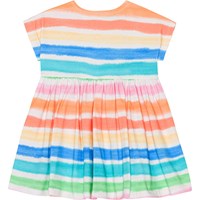 Mehrfarbiges Öko-Kleid mit Allover-Print für die Kleinen. Der Druck besteht aus mehrfarbigen Streifen. Das Kleid hat einen runden Ausschnitt, einen Druckknopfverschluss und einen runden Rock.