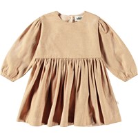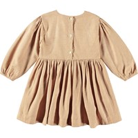 Beigekariertes Kleid für die Kleinen aus Öko-Baumwolle. Das Kleid hat einen Rundhalsausschnitt und ist knielang. Es ist weit geschnitten mit vielen Falten am Rock und hat lange Ärmel mit elastischen Bündchen. Das Kleid lässt sich leicht anziehen, da es hinten mit einem Knopfverschluss versehen ist.