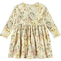 Leichtes Jerseykleid aus Öko-Baumwolle für die Kleinen. Das Kleid hat bequeme Raglanärmel und einen runden Halsausschnitt mit Knopfverschluss hinter der Schulter, was das Anziehen erleichtert. Außerdem hat es einen Rock mit Raffungen, die Bewegung ermöglichen und es angenehm zu tragen machen. Das Kleid ist mit einem niedlichen Wasserfarben-Print von Katzen in Grau, Gelb und hellen Farbtönen verziert.