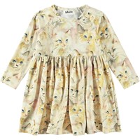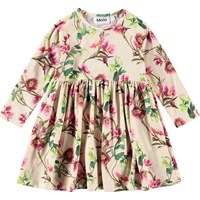 Beiges Jerseykleid aus Öko-Baumwolle für die Kleinen. Das Kleid hat bequeme Raglanärmel und einen Rundhalsausschnitt mit Knopfverschluss hinter der Schulter, was das Anziehen erleichtert. Außerdem hat es einen Rock mit Falten, der Bewegung ermöglicht und angenehm zu tragen ist. Zusätzlich ist das Kleid mit einem Allover-Druck von Weihnachtsrosen in Rosa- und Weißtönen versehen.