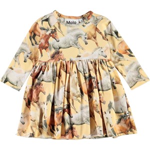 Charmaine ist ein gelbes Babykleid mit Aufdrucken von schönen rennenden Pferden. Das Kleid hat lange Ärmel und einen Rock mit schönem Volumen.