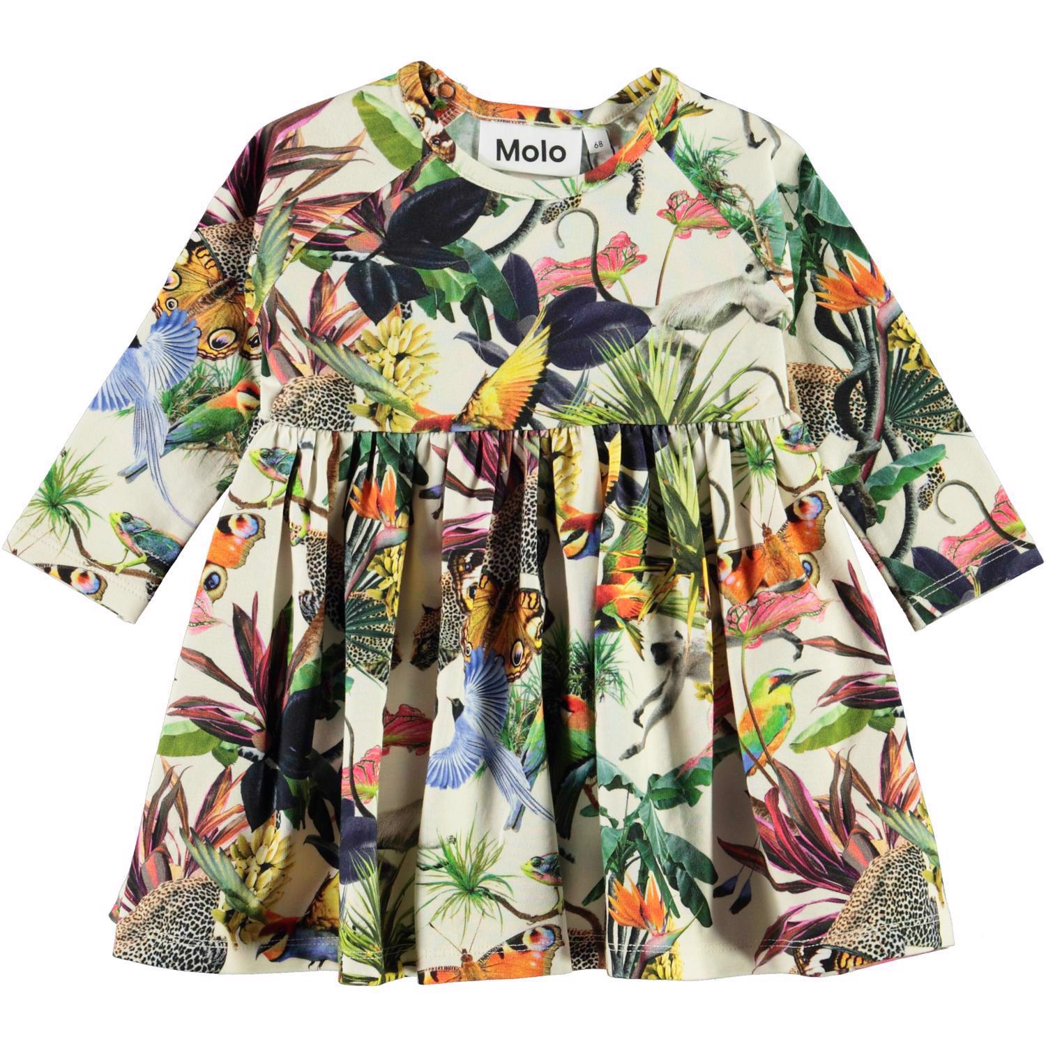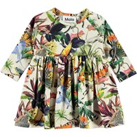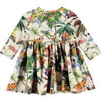 Charmaine ist ein cremefarbenes Babykleid mit einem Print eines Fantasiekleides mit exotischen Tieren und Pflanzen. Das Kleid hat lange Ärmel und einen Rock mit schönem Volumen.