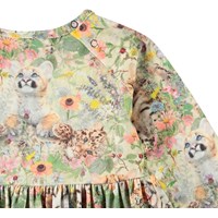Langärmeliges Kleid für die Kleinen aus Öko-Baumwolle. Das Kleid hat einen niedlichen Aufdruck von Tierbabys in einem Blumenbeet. Das Kleid hat enge Raglanärmel und einen runden Halsausschnitt mit Knopfverschluss hinten, was das Anziehen erleichtert. Der Rock hat Falten, die Bewegung ermöglichen und das Tragen bequem machen.