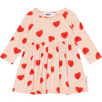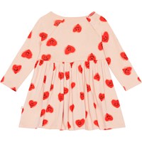 Rosa Öko-Kleid mit Aufdruck, für die Kleinen. Der Aufdruck besteht aus kleinen, roten und fröhlichen Herzen. Das Kleid hat einen Rundhalsausschnitt, einen Druckknopfverschluss, lange Ärmel und einen runden Rock.