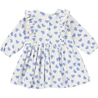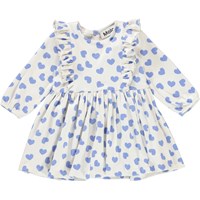 Chocho ist ein weißes Babykleid mit Aufdrucken kleiner blauer Herzen. Das Kleid hat lange Ärmel und Rüschen am Oberteil sowie einen Reißverschluss am Hals.