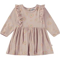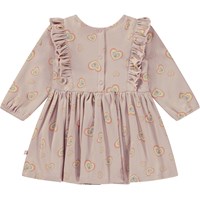 Rosafarbenes Babykleid mit einem Aufdruck von lächelnden Herzen. Das Kleid hat lange Ärmel und Rüschen am oberen Teil sowie einen Reißverschluss am Hals.