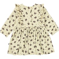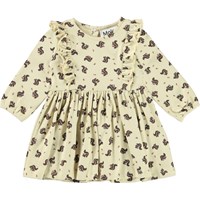 Chocho ist ein gelbes Babykleid mit einem Aufdruck kleiner Eichhörnchen. Das Kleid hat lange Ärmel und Rüschen am Oberteil sowie einen Reißverschluss am Hals.