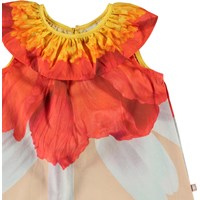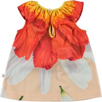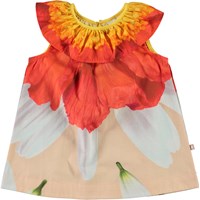 Ciera ist ein Babykleid ohne Ärmel und mit einem Aufdruck einer großen Blume und einer Rüschenkante am Kragen.