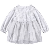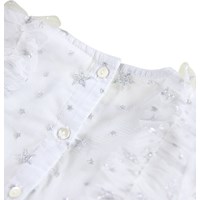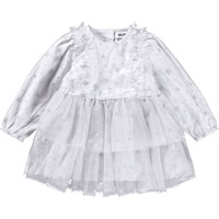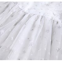 Tüllkleid für die Kleinen mit silbernen funkelnden Sternen. Das Kleid hat Rüschen vorne und zwei Lagen Tüll im Rock für schönes Volumen, sowie elastische Bündchen an den Handgelenken. Das Kleid ist gefüttert und hat einen Knopfverschluss hinten, um es bequem zu tragen und leicht anzuziehen.