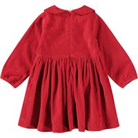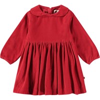Rotes Samtkleid für die Kleinen, aus Öko-Baumwolle gefertigt. Das Kleid hat einen niedlichen kleinen Kragen und ist knielang und oversized. Es hat viele Falten am Rock und lange Ärmel mit elastischen Bündchen. Das Kleid ist einfach anzuziehen mit einem unsichtbaren Reißverschluss auf der Rückseite.