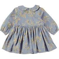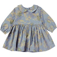 Hellblaues Babykleid mit kleinem Blumendruck. Das Kleid ist aus 100% Baumwolle. Das Kleid hat lange Ärmel, einen Kragen und einen Reißverschluss am Hals.