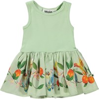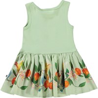 Cordelia ist ein hellgrünes ärmelloses Babykleid aus 100 % Öko-Baumwolle. Das Oberteil des Kleides ist aus geripptem Jersey, während der angenähte Rock aus Popeline ist. Auf dem Rock sind bunte Vögel aufgedruckt, die auf den Zweigen des Mandarinenbaums sitzen, zwischen orangefarbenen Mandarinen und Mandarinenblüten.