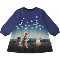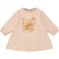 Rosa Sweatkleid für die Kleinen aus Öko-Baumwolle mit einer gebürsteten Innenseite, die es weich und warm zu tragen macht. Das Kleid ist A-Linie mit langen Ärmeln, einem Rundhalsausschnitt mit geripptem Saum und Knopfverschluss. Das Kleid zeigt einen Druck von einem mit Aquarell gemalten Katzenkopf.