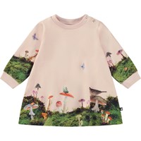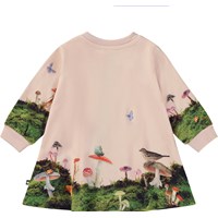 Rosafarbenes Babykleid mit Aufdruck von Wald, Pilzen und verschiedenen Tieren. Das Kleid hat lange Ärmel und Druckknöpfe an einer Schulter.