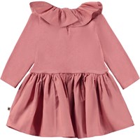 Rosa langärmliges Babykleid aus 100% Öko-Baumwolle. Das Kleid hat dort einen süßen runden Kragen, und der Rock ist aus Popeline . Das Kleid hat einen Druckknopfverschluss am Hals, der das An- und Ausziehen des Kleides erleichtert.