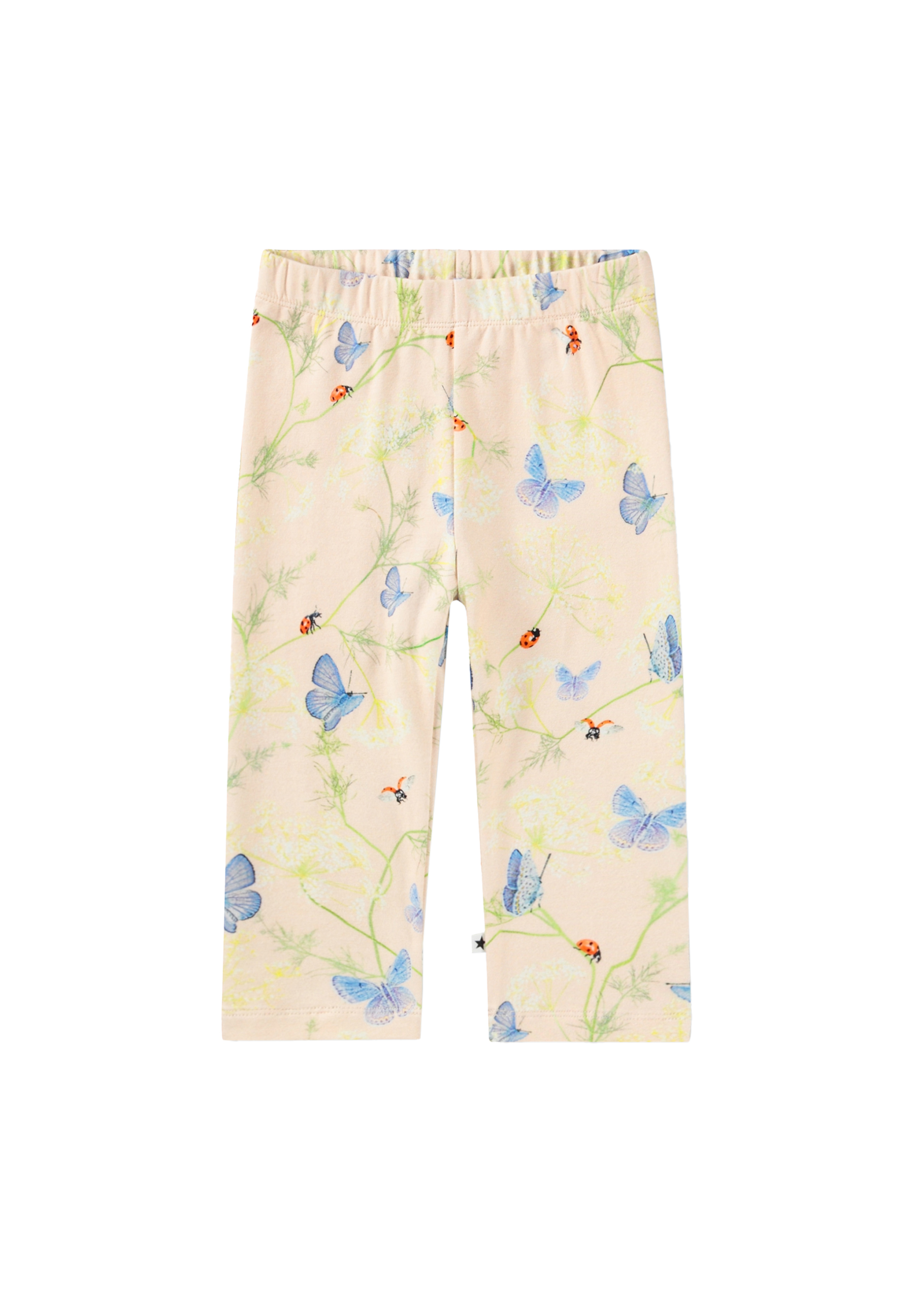 Rosa Leggings für die Kleinen aus Bio-Baumwolle mit Schmetterlingsdruck. Sie haben einen elastischen Bund und eine weiche, bequeme Passform.