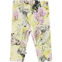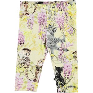 Klassische hellgelbe Babyleggings mit Kätzchen, die in der Glyzinie spielen. Der elastische Bund und das weiche Material sorgen für eine gute Passform.
