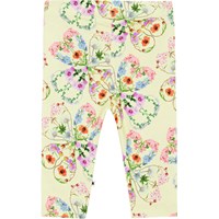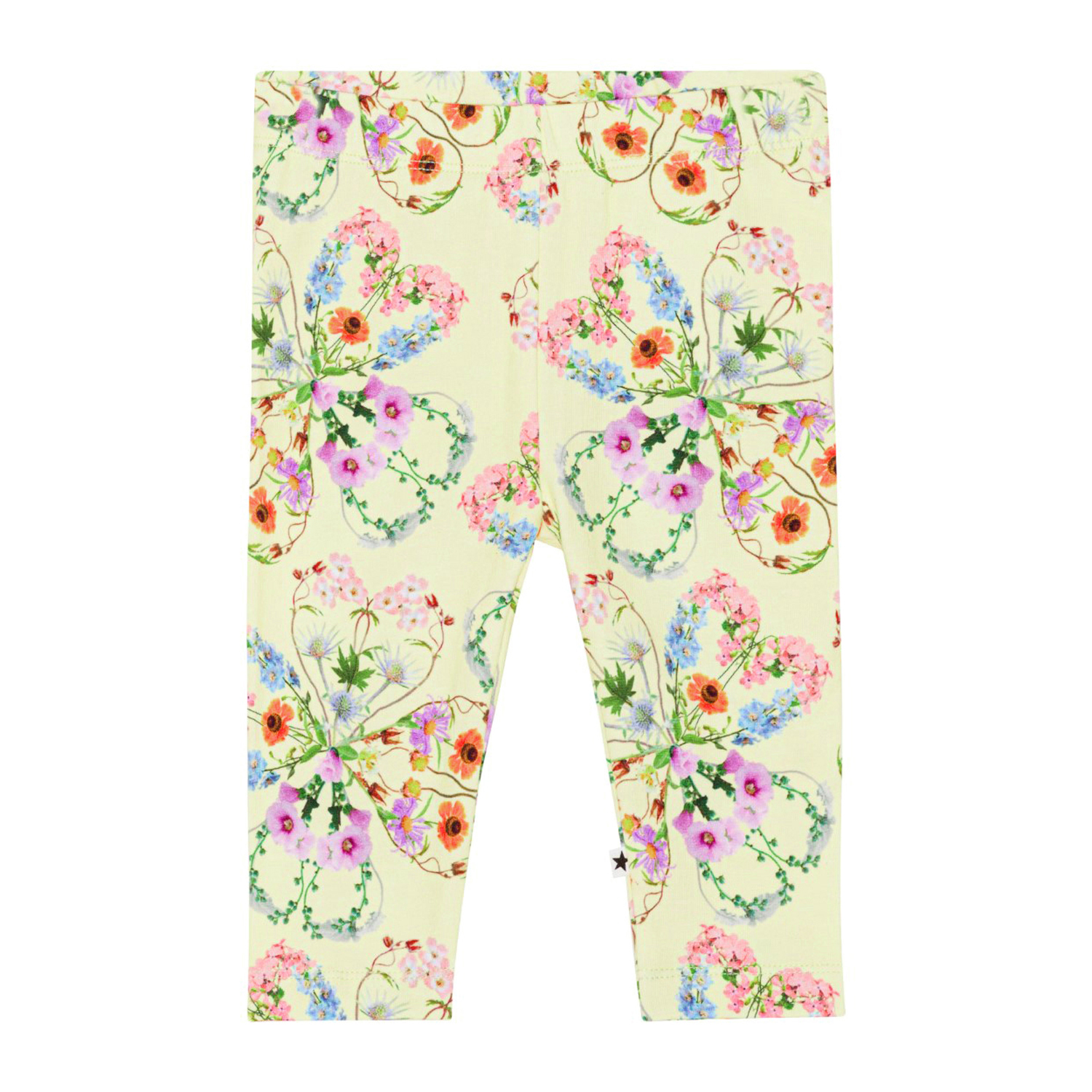 Hellgelbe Öko-Leggings mit Aufdruck, für die Kleinen. Der Druck besteht aus verschiedenen bunten Blumen, die zusammen sowohl Herzen als auch Kleeblätter bilden. Der elastische Bund und das weiche Material sorgen für eine gute Passform.