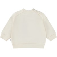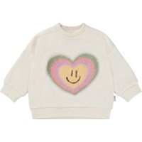 Weißes Baby-Sweatshirt mit Aufdruck eines lächelnden Herzens in Pastellfarben auf der Vorderseite. Die Bluse hat Raglanärmel und einen Knopfverschluss am Hals.