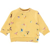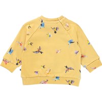 Dicte ist ein Baby-Sweatshirt in Gelb mit einem Aufdruck kleiner Vögel. Das Sweatshirt hat Raglanärmel und einen Knopfverschluss am Hals.